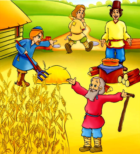 «Из нашей пшеницы получается лучший хлеб в стране!» — говорит Андрей. «Из нашей пшеницы получаются лучшие пироги в стране!» — говорит Сергей. «Могу ли я помочь вам в поле?» — спрашивает Иванушка. «Мне тоже нравится наша пшеница». «Нет! Иди собирай грибы!» — говорит Андрей. «Глупый мальчишка! Возвращайся и садись на печь!» — говорит Сергей.