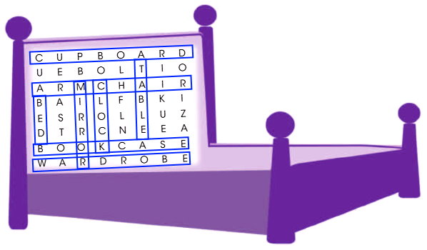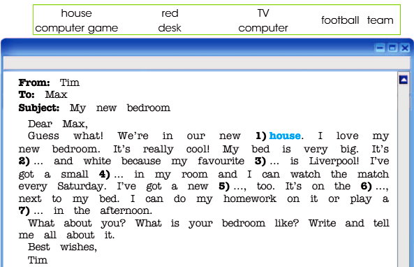 Guess what! We’re in our new 1) house. I love my new bedroom. It’s really cool! My bed is very big. It’s 2) red and white because my favourite 3) football team is Liverpool! I’ve got a small 4) TV in my room and I can watch the match every Saturday. I’ve got a new 5) computer, too. It’s on the 6) desk, next to my bed. I can do my homework on it or play a 7) computer game in the afternoon.