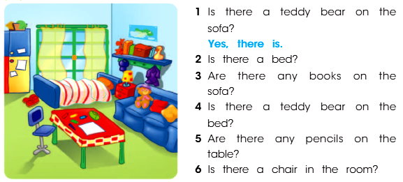 1. Is there a teddy bear on the sofa? – [Из з’еэ э тэдди беэ: он з’е соуфа?] – Есть ли плюшевый мишка на диване?
