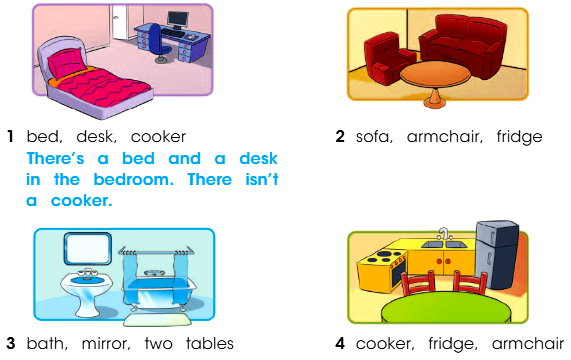 1. There is a bed and a desk in the bedroom. There isn’t a cooker. – В спальне есть кровать и письменный стол. Там нет плиты.