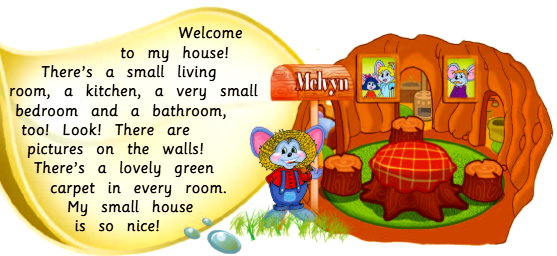 Welcome to my house! There’s a big living room, a green kitchen, a nice bedroom and a blue bathroom, too! Look! There are pictures on the walls! There’s a mirror in the bathroom. There’s a lovely white carpet in the living room. My house is so nice!