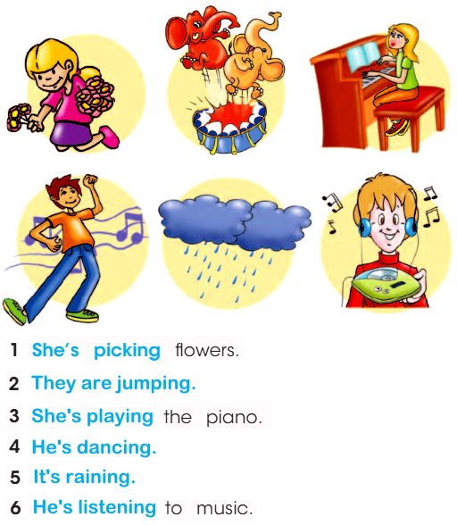1. Look and make sentences. Use: pick, listen, jump, play, rain and dance. – Посмотри и составь предложения. Используй: pick, listen, jump, play, rain и dance.