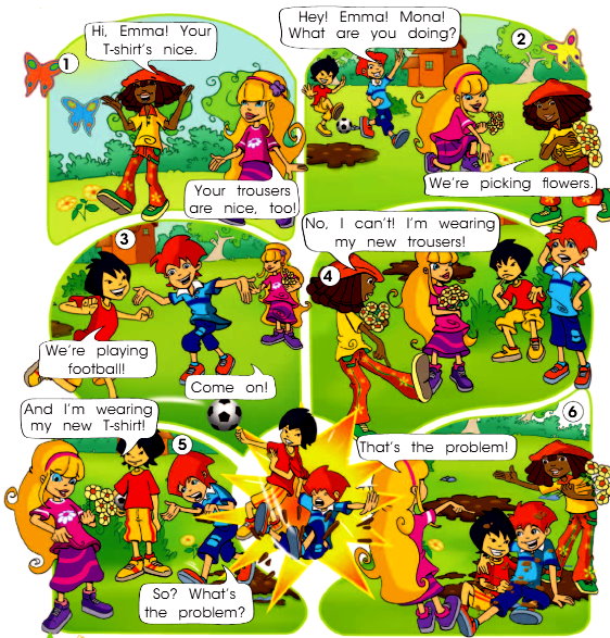 − Hi, Emma! Your T-shirt’s nice. − Привет, Эмма! У тебя милая футболка.