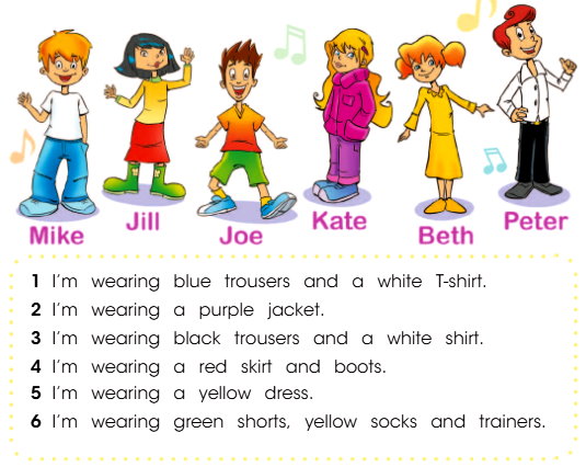 - I’m wearing green shorts, yellow socks and trainers. – [Айм уэрин грин шотс, йеллоу сокс энд трэйнез] – На мне зелёные шорты, жёлтые носки и кроссовки. (Joe – Джо)