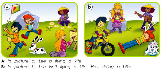 B: In picture b, Lee isn’t flying a kite. He’s riding a bike. – [Ин пикчэ би, Ли изнт флаин э кайт. Хиз райдин э байк.] – На картинке b Ли не запускает воздушного змея. Он катается на велосипеде.