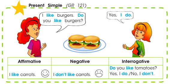 A: I like burgers. Do you like burgers? – Я люблю бургеры. А ты любишь бургеры?