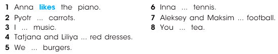 1. Complete the sentences. Use like or likes. – Закончите предложения. Используйте like или likes.