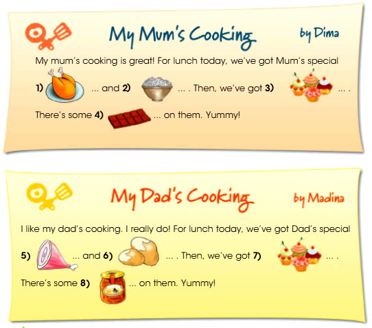 My mum’s cooking is great! For lunch today, we’ve got Mum’s special 1) chicken and 2) rice. Then, we’ve got 3) fairy cakes.There’s some 4) chocolate on them. Yummy!